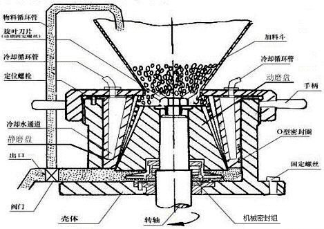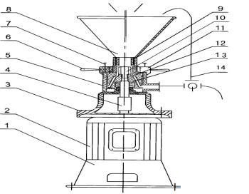 9.進(jìn)料通道 10.旋葉刀 11.調(diào)節(jié)盤 12.靜磨盤 13.動(dòng)磨盤 14.循環(huán)管