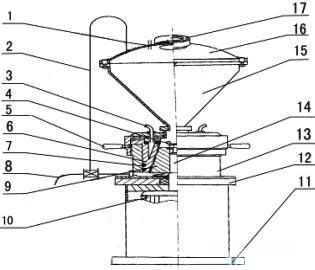 9.手柄10.壓蓋 11.活接 12.加料斗 13.旋葉刀 14.動(dòng)磨盤 15.靜磨盤 16.調(diào)節(jié)盤