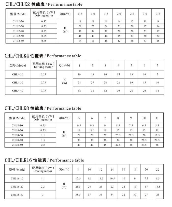 CHL,CHLK輕型不銹鋼多級離心泵(性能參數(shù))