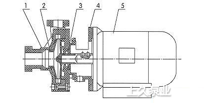 1、泵殼 2、葉輪-軸總成 3、機(jī)械密封 4、泵蓋 5、電機(jī)